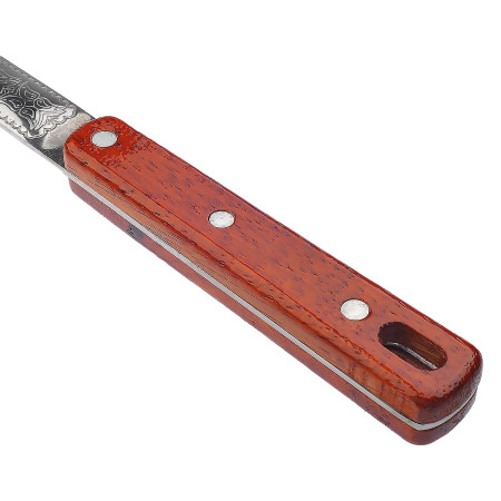 Изделие ручной работы, не китайская штамповка, прекрасно подойдет для средних казанов 10-25 литров. Повышенная прочность шумовки обусловлена толщиной нержавейки 2 мм.   Ручка выполнена полукругом как ребро жесткости. Диаметр круга - 13 см. Шумовка под казан не только отлично выполняет свои функции, но и благодаря узорам и деревянно ручке очень красиво будет смотреться на вашей кухне. Деревянная ручка не нагревается и не обжигает руки.