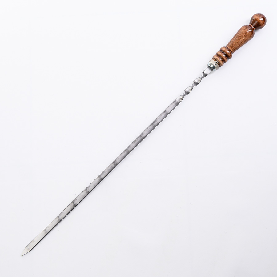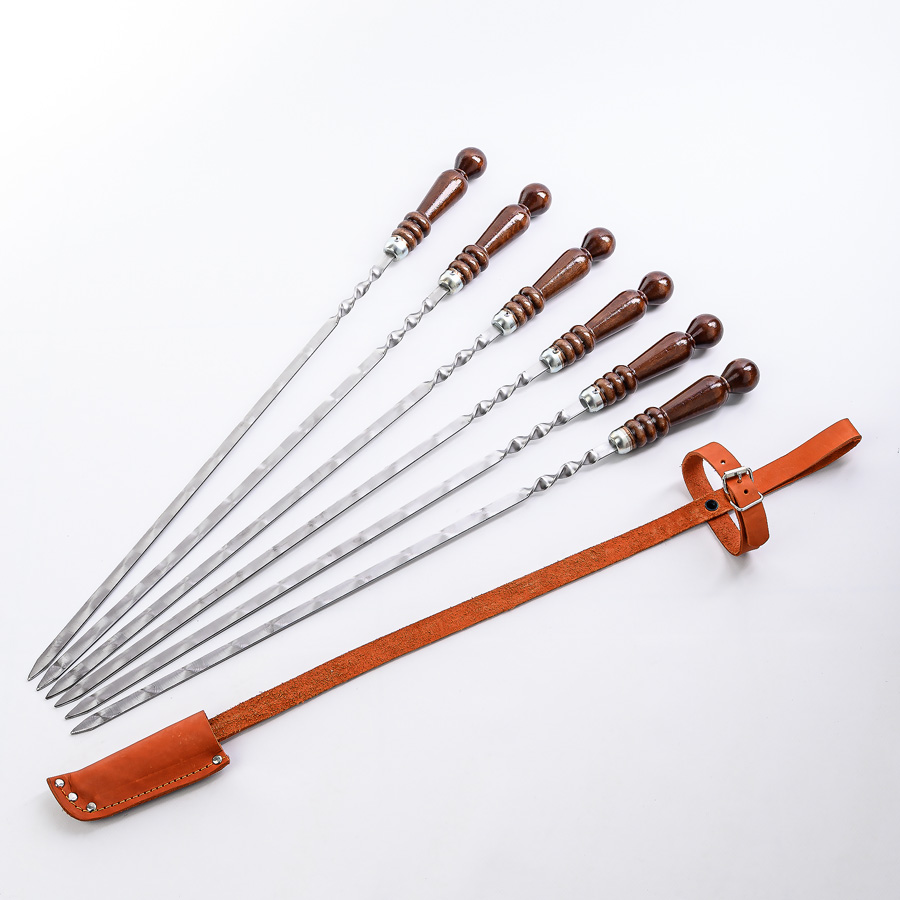 Набор из 6-ти нержавеющих шампуров 670*12*3 мм с деревянной ручкой в кожаном колчане изготовлен из высококачественной нержавеющей стали толщиной 3 мм. Ширина лезвия - 12 мм. Длина рабочей поверхности - 500 мм. Общая длина каждого шампура - 670 м..