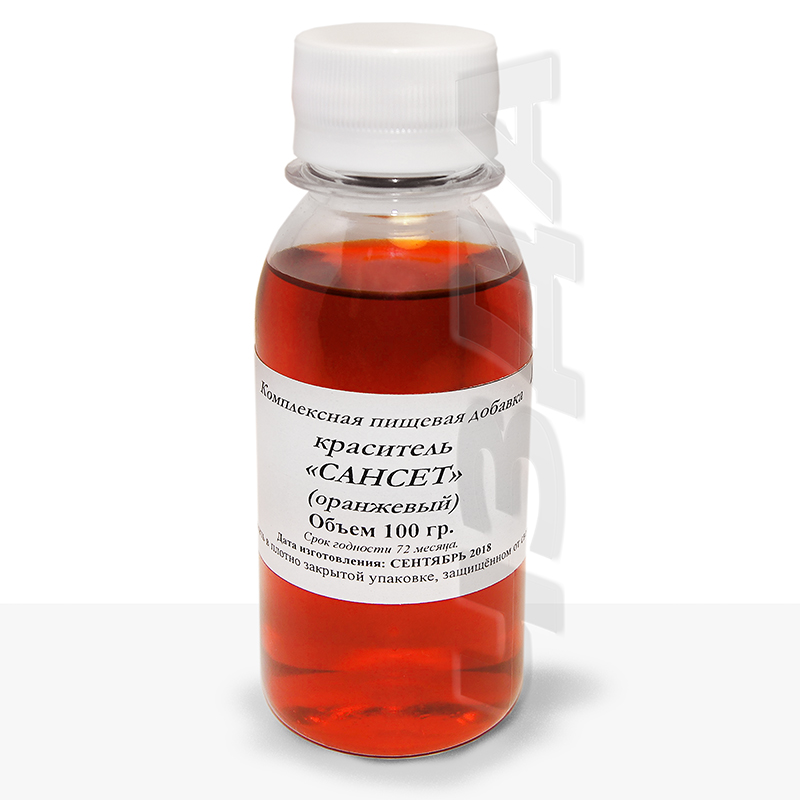 Food dye "Sunset" Orange 100 ml (E110) is used in industry for dyeing various food groups. It is used as its own for dyeing various drinks and products from orange to yellow shades.      ..