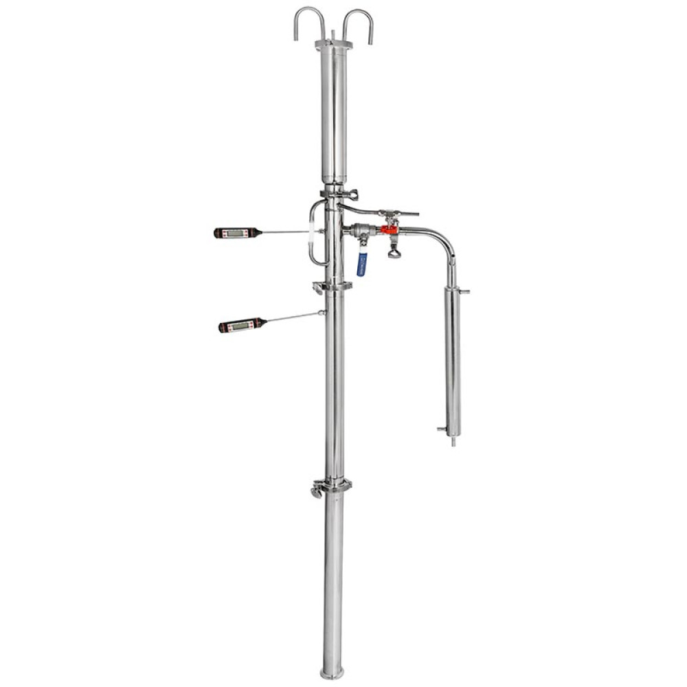 All connections are clamp, they are completely tight, much more convenient than threaded ones. The thermometers included in the package will allow you to continuously monitor the temperature inside the cube, drawer, in the selection unit. Owner reviews indicate the convenience of a distillation column in any mode of use.