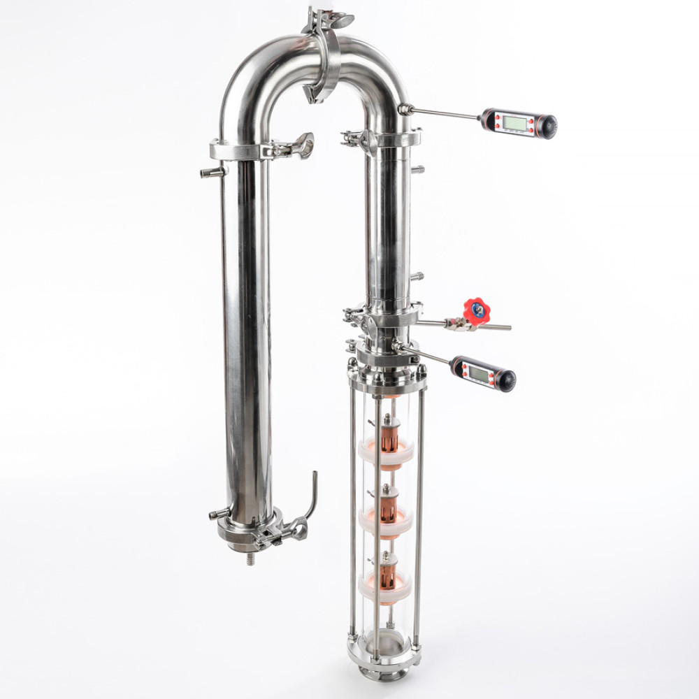 The column is adjusted by adjusting the heating level and cooling rate of the reflux condenser, in the operating mode the capacity reaches 2 liters of the finished beverage per hour. Copper caps perform additional purification of alcohol from impurities, removing all sulfur compounds from the product. Copper has been used in the production of distillates for hundreds of years, it is a justified choice.