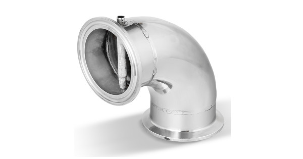 The connecting element provides reliable, strong and tight connection of pipes in a distillation column and a distiller. Transition of 90 degrees is made of food grade AISI 304 stainless steel. Fastening - under the clamp 2 inches (64 mm)..