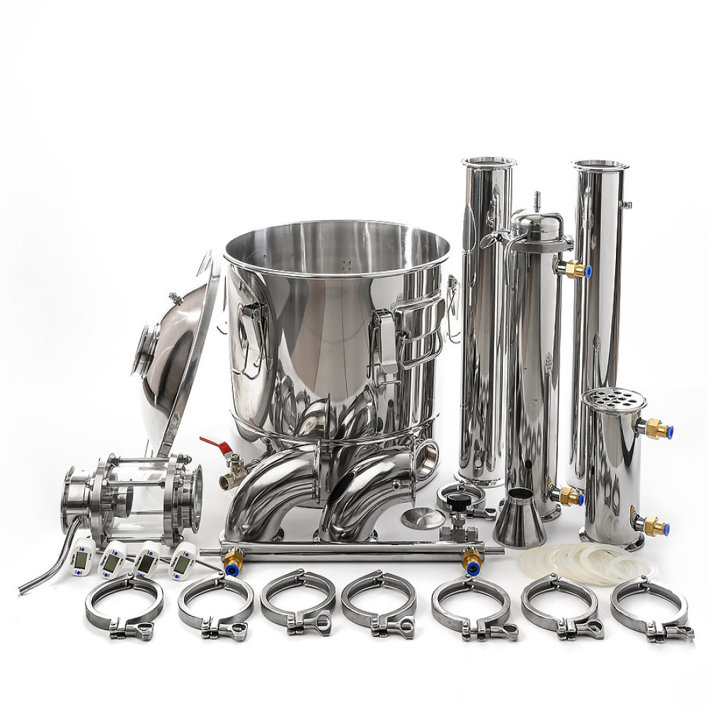 A powerful 3-inch shell-and-tube cooler with a length of 40 cm, inside of which there are 12 tubes with a bore diameter of 10 mm, makes it possible to utilize up to 10 kW of supplied heating power per distillation cube with relatively small volumes of water consumption (depending on the temperature of the supplied water). A diopter with a built-in liquid take-off unit allows the user to set the column to a “pre-flooded” state, which will increase the separating ability of the column, which will allow 96.6% alcohol to be removed at high speed. The combination of liquid take off and 2-in-1 diopter simplifies column assembly and reduces the number of fittings. The jacket-type aftercooler has a diameter of 25 mm and a length of 350 mm, which indicates its high performance. For operation in potstill and distillation modes, two 90-degree outlets have been added to this package, one of which has a fitting for a thermometer, a powerful 3-inch shell-and-tube reflux condenser 20 cm long, inside which there are 12 tubes with a through diameter of 10 mm.