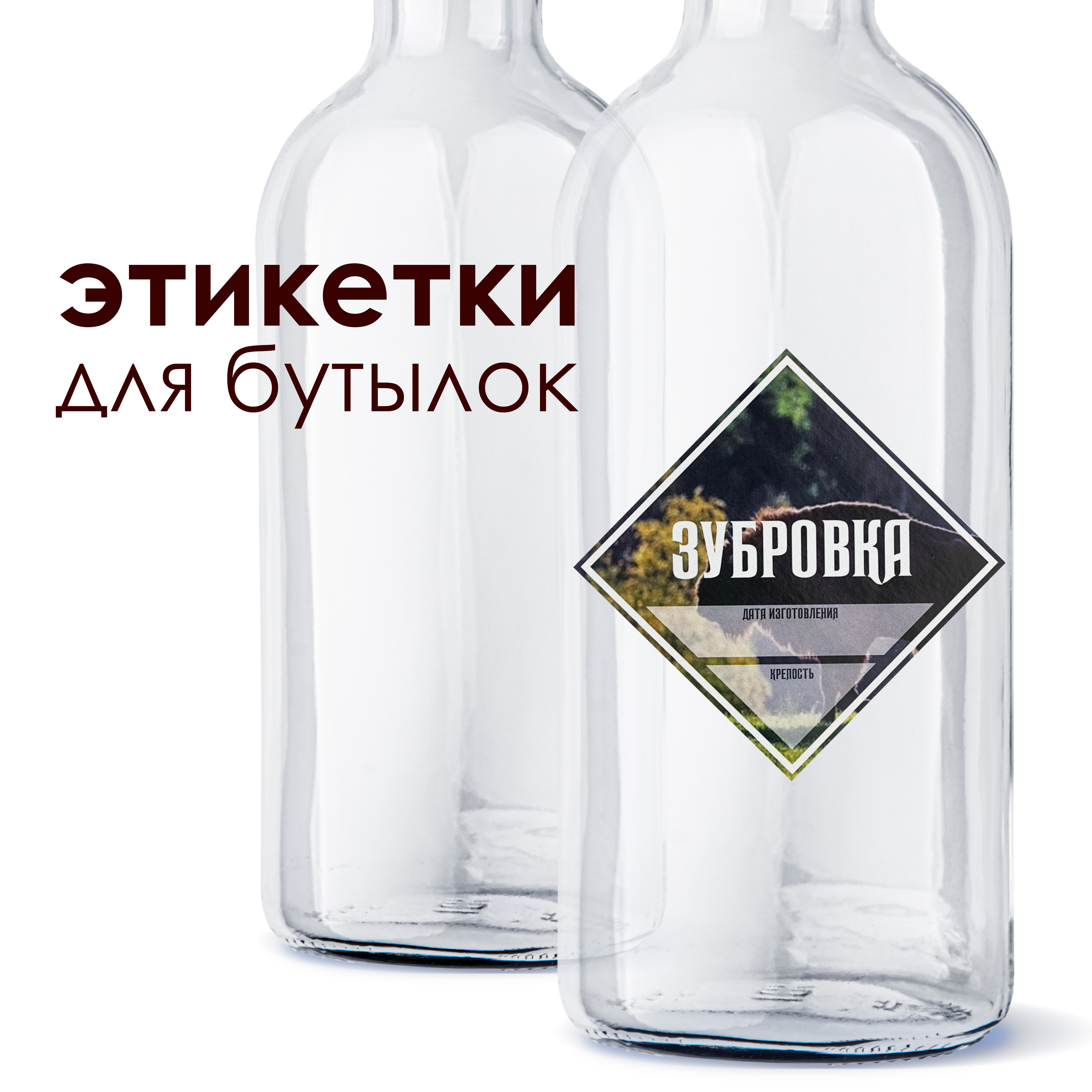 Etiketka dlya butylok "Zubrovka"Samokleyashchayasya etiketka "Zubrovka" prednaznachena dlya oformleniya butylok s napitkom sobstvennogo prigotovleniya.Razmer: 85 * 85 mmNa naklejke raspolozheno dva polya dlya ruchnogo zapolneniya:Data izgotovleniyaKr..
